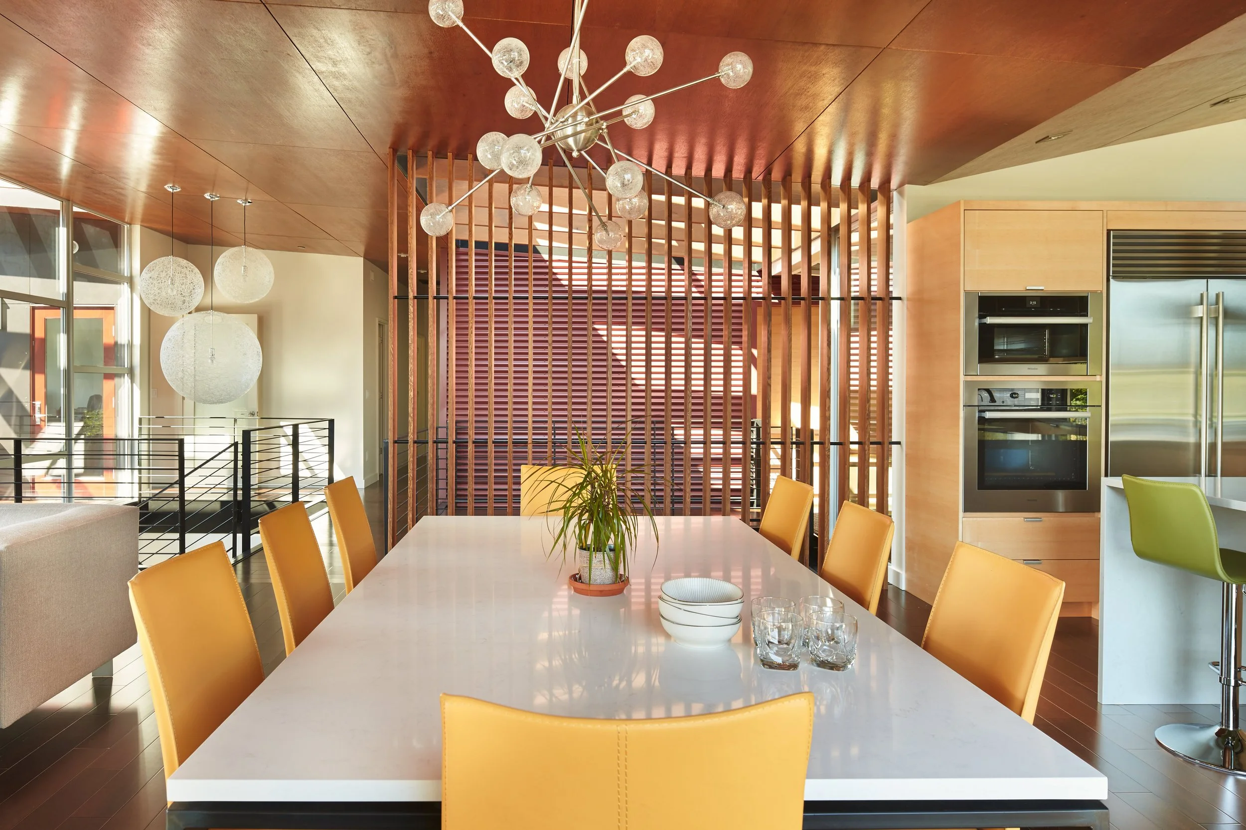 The main living spaces are screened from the entry with a vertical wood screen, and the space can be completely opened up to the large western deck with views of a grove of trees below. An exterior chimney ties the two levels together visually and provides fireplaces for warmth at both the upper and lower covered outdoor spaces. Nearly all of the spaces along the west spill out onto either the upper decks or lower continuous terrace, to facilitate a connection with the site and natural environment throughout the seasons.