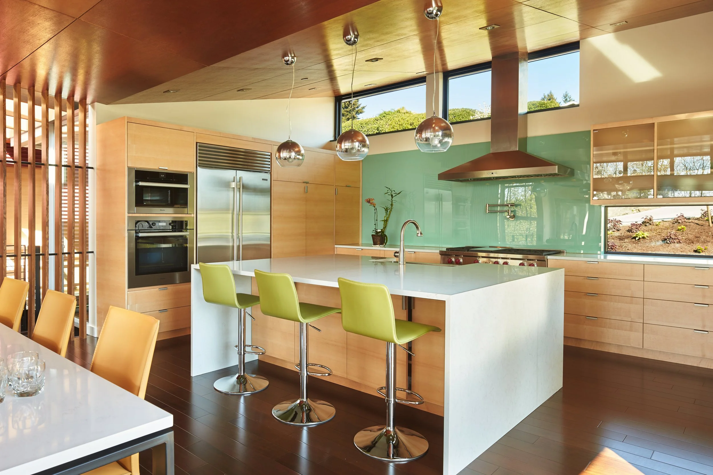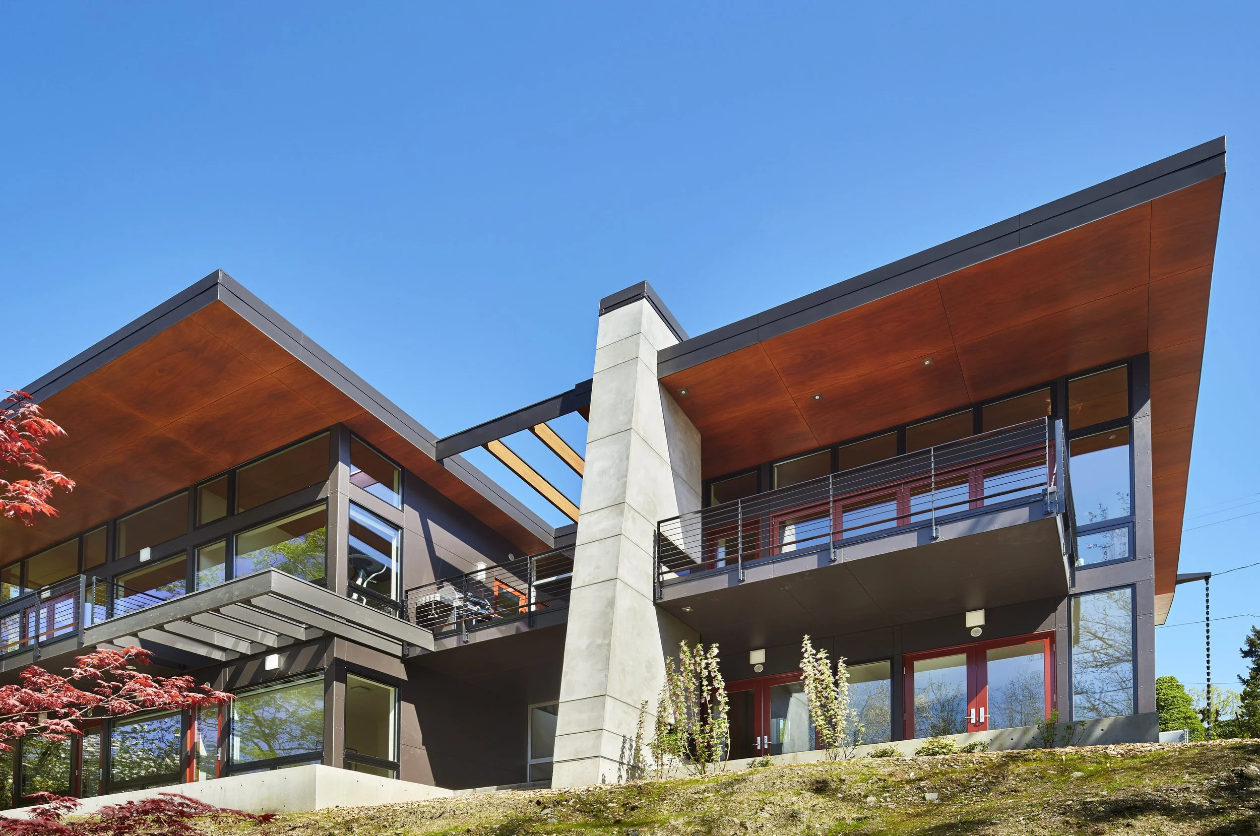 The exterior roof forms are a modern take on traditional shed roofs with large overhangs, often used in the Pacific Northwest for their ability to shed rain and provide covered areas outdoors. Exterior materials were selected for their durability, with muted dark panels accented by brighter colors and natural wood.