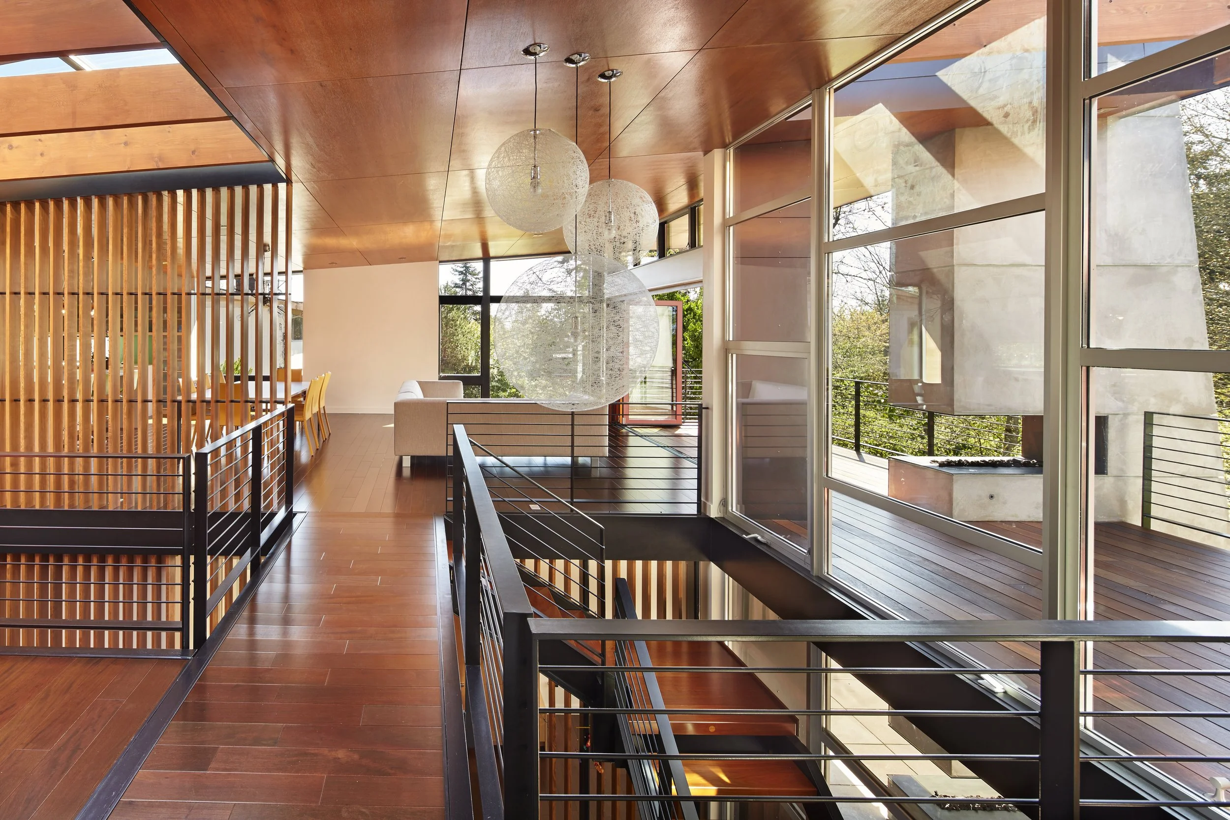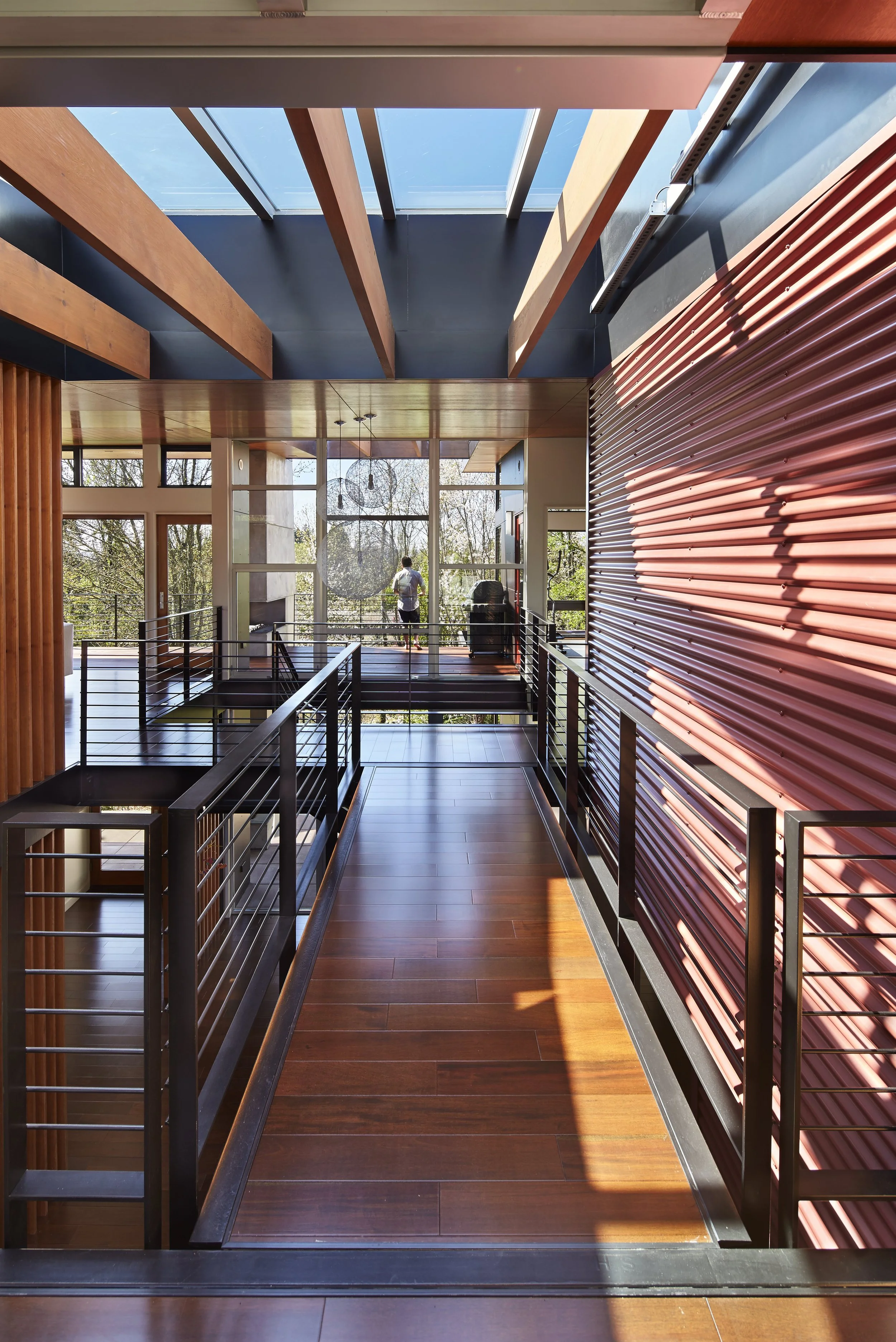 Nestled into a sloping site, the bridge residence is entered by a series of bridges which span over an entrance light well before meandering into and over an interior double height entry space. This entry space is flooded with natural light from the skylight above, and serves to create a buffer between the common living areas and the bedrooms/ office on the upper level, and between the master suite and the kids bedrooms below; a separation that was desirable to this three generation household.